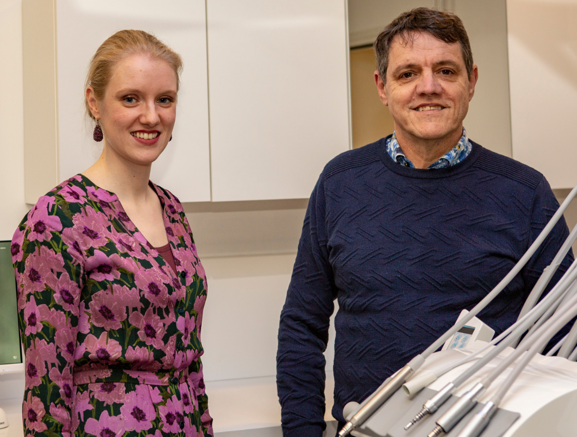 NISTELRODE – Jo van Pinxteren is al 37 jaar tandarts in Nistelrode, en 35 jaar lang gold dat ook voor Oss. Sinds januari 2021 is de praktijk in Oss opgeheven en zijn alle patiënten welkom in de praktijk in Nistelrode. In 2017 is de praktijk verhuisd van de locatie op Laar naar het ruimere pand ernaast; de vroegere melkfabriek. De moderne praktijk heeft drie behandelkamers en een fraaie wachtruimte met veel daglicht. Voor veel mensen is een tandartsbezoek nou niet bepaald een uitje, en de vertrouwde gezichten van de eigen tandarts en de assistentes heeft dan toch iets geruststellends. Want ook de assistentes blijven hun post trouw: van de vier medewerkers draait één assistente al 28 jaar mee, een ander vijftien jaar, en twee assistentes zijn er enkele jaren geleden bijgekomen. Jo, met gepaste trots: “Er zijn nog nooit assistentes bij ons weggegaan.” Dat zegt wel wat over de sfeer, maar ook over de expertise. De assistentes worden volgens een roulerend systeem ingezet op alle voorkomende taken, en de patiënten hebben altijd hun eigen tandarts: ofwel Jo, ofwel Emese, die na haar afstuderen in 2019 in de praktijk is ingestapt.